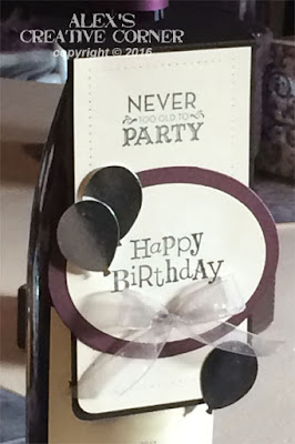 The mains sentiment was mated onto a larger purple oval and attached to the front of the tag. I finished it off with a little silver organza bow and a few punched foil balloons that were attached with foam squares for bit of dimension.