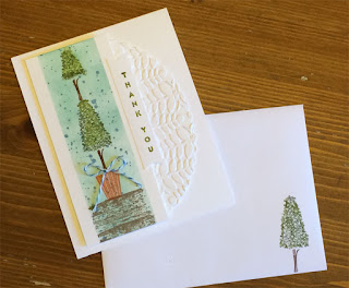 Using markers I coloured the Topiary stamps, above sample used Chocolate Chip, Mossy Meadow, Always Artichoke and Cajun Craze for the pot. I also stamped a shorter "cut" version of the topiary on the inside bottom right of the card and bottom right of the envelope to mach.