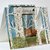 I started by cutting a piece of white cardstock in half length wise to create a 5.5" x 8.5" strip. I then masked off three sections evenly spaced approx. 1.5" wide. I sponged each strip in light blues (Pool Party & Soft Sky) and stamped them with the spotted background texture from Gorgeous Grunge using a darker blue (Marina Mist). Then the ground was stamped in brown (Tip Top Taupe) using a stamp from Timeless Textures.
