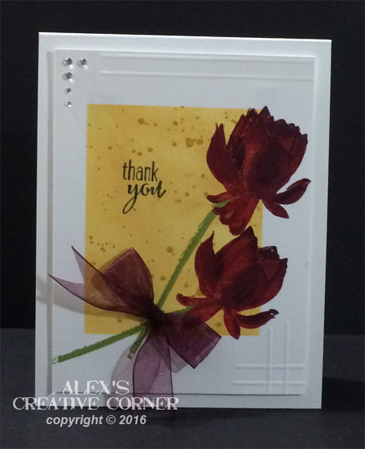 The card front was embossed with a frame folder and then attached to the white card base using foam tape/mounting squares. A pretty peach organza bow was attached to the bottom of the flower stems and the flower center was embellished with 3 little rhinestones.